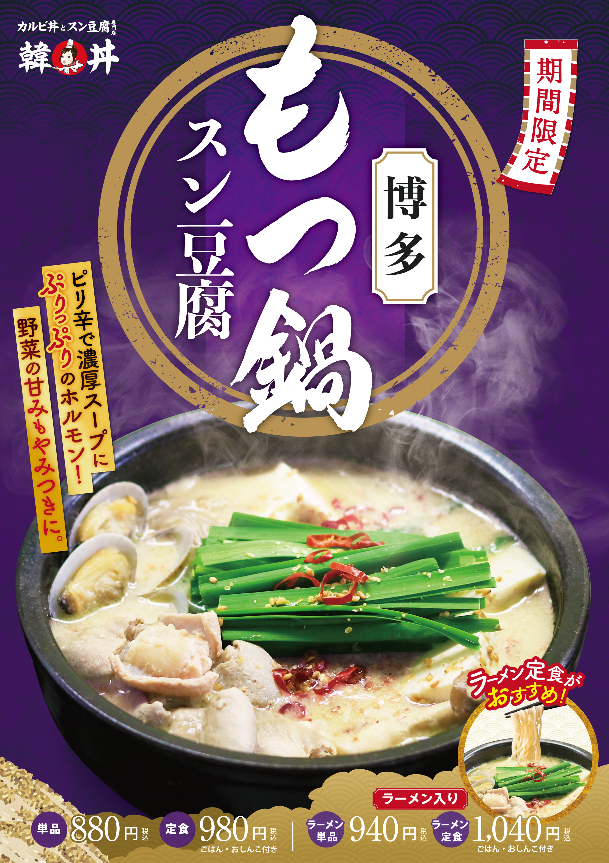 日本初の焼肉のファストカジュアルチェーン『カルビ丼とスン豆腐専門店 韓丼』を展開する株式会社やる気(所在地:京都市伏見区北端町60番地、代表取締役 大島幸士)は、2024年3月1日~5月20日の期間限定で、「博多もつ鍋スン豆腐」(単品:880円、定食:980円)を発売いたします。